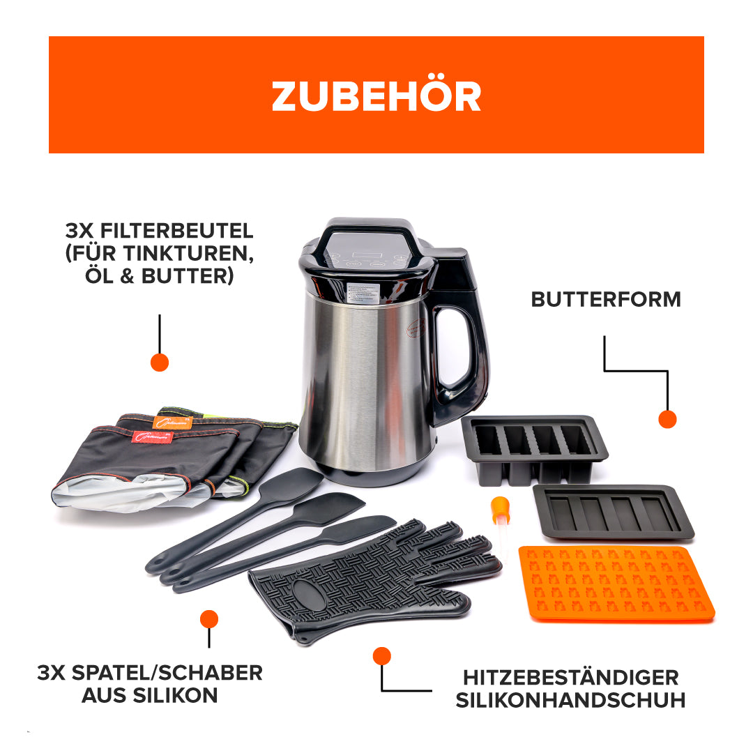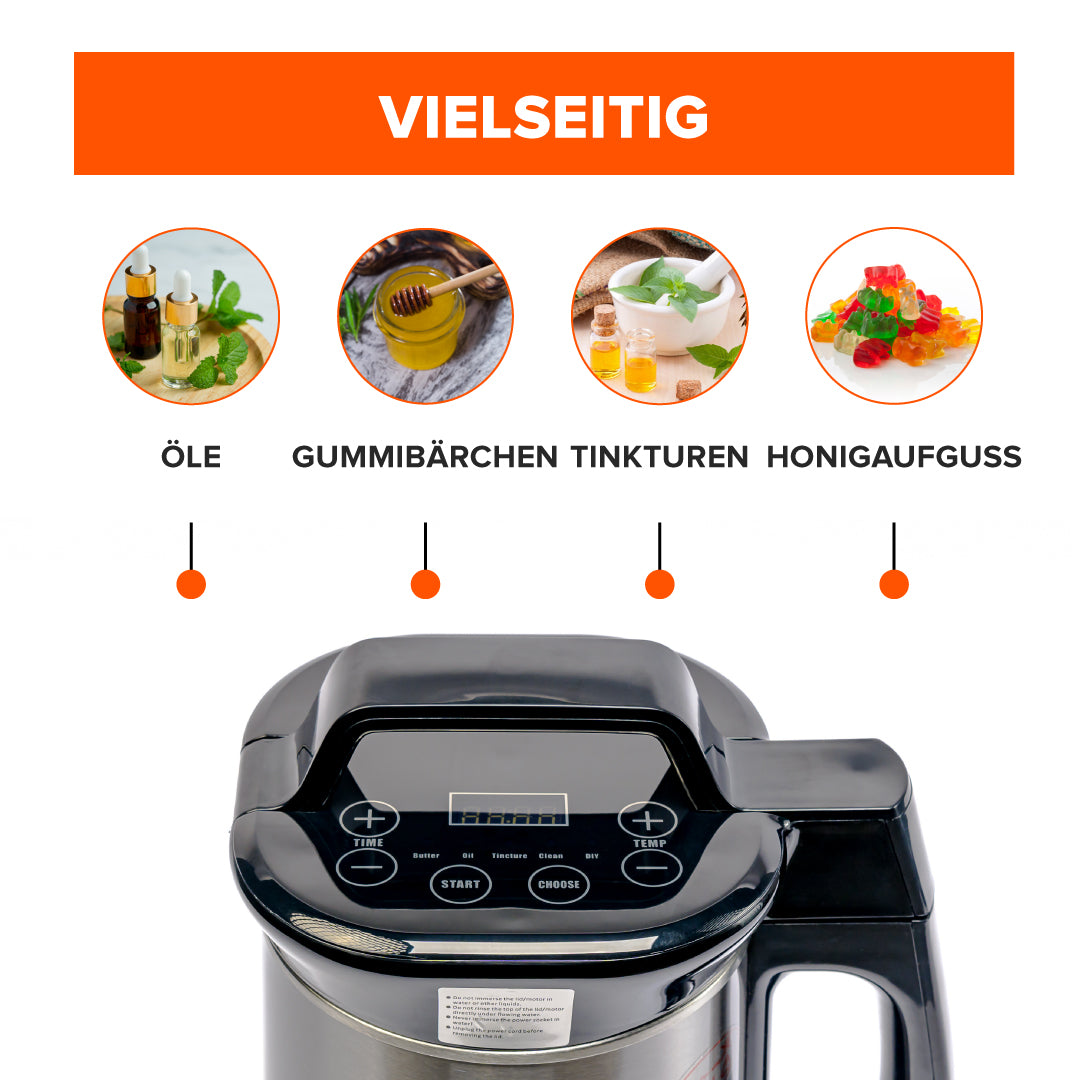MagiCook makes it all: Premium kitchen appliance for making many homemade recipes with herbs (herbal oil, butter, honey, skincare products and more) without the hassle or mess of traditional methods.