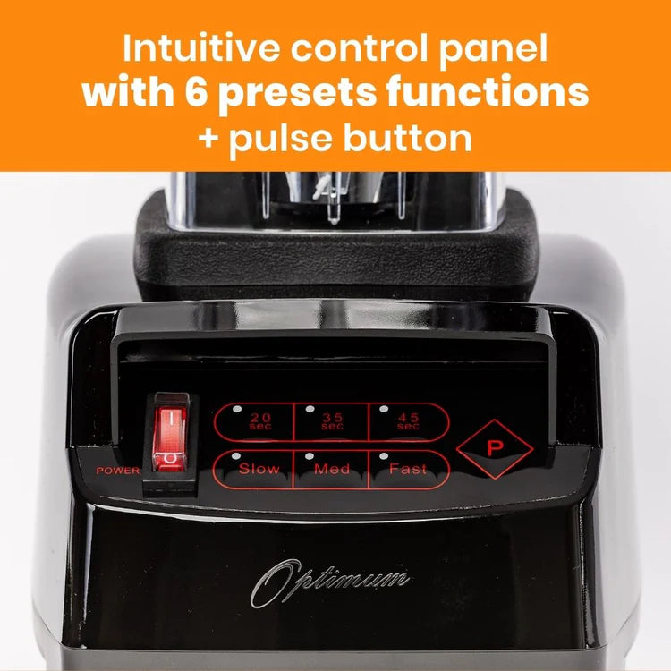 The Optimum is equipped with a self-compensating energy-efficient motor that can reach an output of 2,611 watts and a top speed of up to . The open-die forged stainless steel 6-blade insert is perfect for crushing ice in seconds to make the best smoothies and milkshakes. The motor is self-compensating, resulting in reduced power consumption and allowing the Vortex blender to withstand heavy use in cafes and juice bars. To protect the motor from overheating, the Optimum is equipped with a shut-off button, ideal for juice bars looking for a long-lasting reliable Vortex blender.