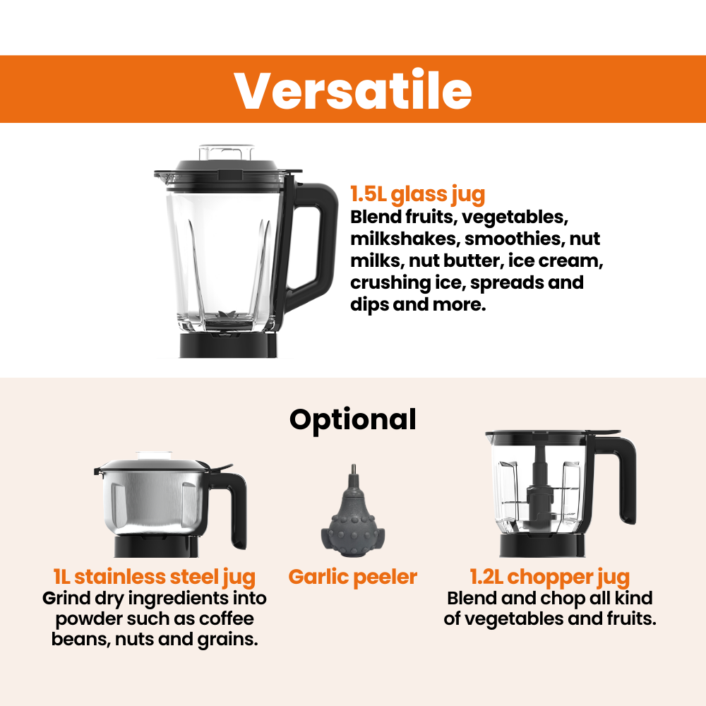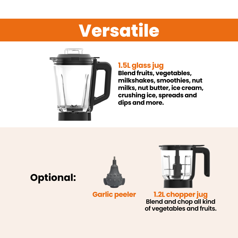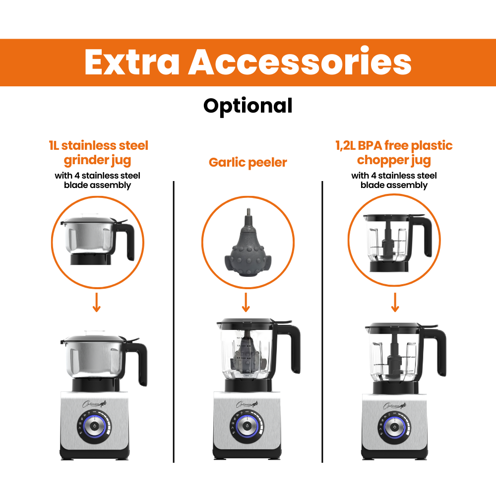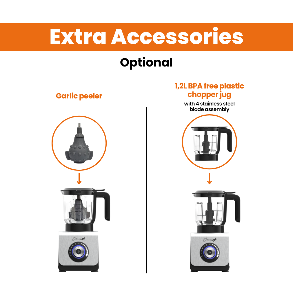 ADDITIONAL ACCESSORIES: Comes with an optional 1.2L BPA-free plastic food processor (chopper) for added versatility and a 1L stainless steel jug for grinding and nut butter. Plus tamper for smooth blending + garlic peeler (optional).
