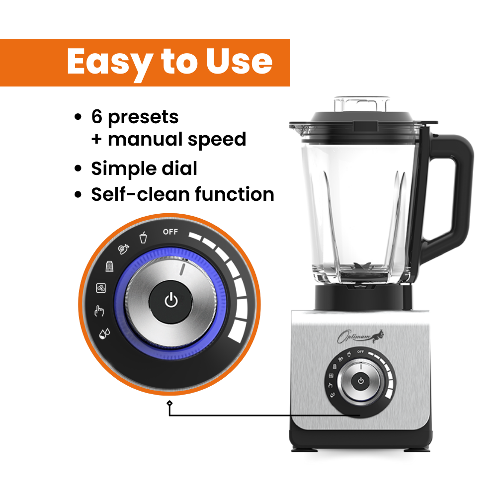 Equipped with an intuitive speed control dial, the Optimum 9400 Essential smoothie drink maker offers six automatic preset functions. For those who demand ultimate control, the speed control dial also allows for variable speed blending. From gentle stirring to vigorous blending, the possibilities are endless with the food blender Optimum 9400 Essential.